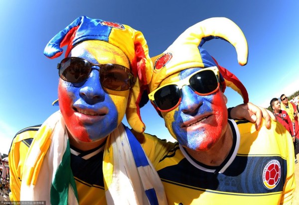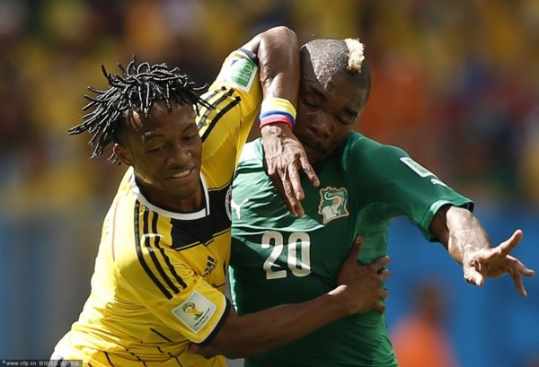 English words line information:Colombia 2-1 in World Cup Group C game to beat Cpte d'Ivoire, the first 21 minutes of the first half has been rather interesting scene. Colombia was the